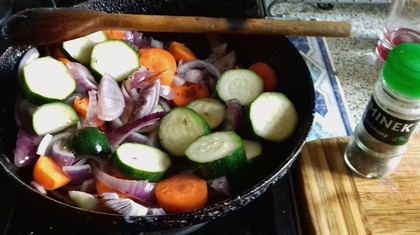 Dołożyć cukinię. Wymieszać, smażyć dalej.