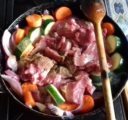Gdy warzywa będą obsmażone, dołożyć mięso (można dodać łyżkę tłuszczu). Zwiększyć ogień, doprawić kminkiem i pieprzem. Smażyć mieszając energicznie, do obsmażenia każdego kawałka mięsa.