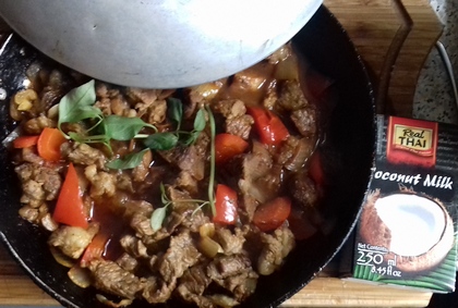Gdy mięso zmięknie, usunąć bazylię, dołożyć paski papryki żółtej, a po 5 minutach dolać mleczko kokosowe. Wymieszać, doprawić do smaku, podawać, gdy sos się zagrzeje.