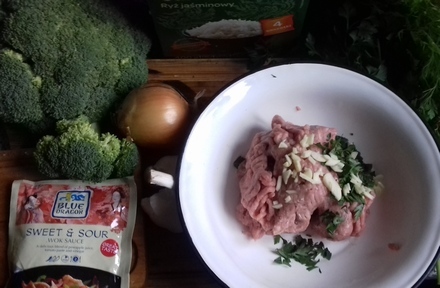 W połowie smażenia dorzucić cebulę. Smażyć do wysmażenia pulpetów. Dołożyć różyczki brokuła, łodygami do dołu, zalać sosem słodko-kwaśnym.