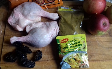Udka oczyścić, natrzeć solą i curry. Cebulki oczyścić, pozostawić w całości lub przekroić na pół. Na patelni z grubym dnem rozgrzać olej. Obsmażyć udka z obu stron, dodając przy odwracaniu cebulki. Zalać wodą, dorzucić śliwki i posiekany owoc gamboge. Doprawić sos curry, solą i pieprzem; kto chce przełamać smak, może dodać pół łyżeczki cukru.