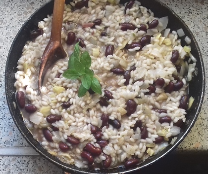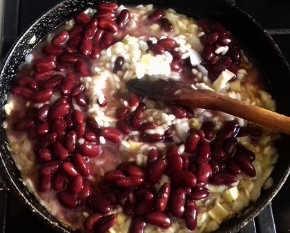 Gdy cebula się zeszkli, wmieszać ryż. Gdy ryż się zeszkli, zalać go wodą i posolić lub bulionem warzywnym (wtedy nie solić). Podlewając płynem dusić, aż ryż zacznie mięknąć (ok. 15–20 minut). Wtedy dodać fasolę z puszki (można ją odcedzić, ale można dodać do ryżu z zalewą).