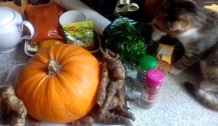Druga z potraw łączących dwa składniki ma charakter podobny. Można ją także podawać samą, choć wtedy nieco inaczej potraktować na zakończenie, ale może być dodatkiem do obiadu z rybą lub mięsem. To połączenie wymyśliłam z konieczności. Przyjaciółka (Bożenko, dziękuję) obdarowała mnie bulwami topinambura, który w jej ogródku rozpiera się jak chwast. Warto wiedzieć, że jest to botanicznie rodzaj słonecznika. Bardzo szybko się rozplenia. Można go także znaleźć na stoisku warzywnym w markecie lub na bazarze. Dynię dostałam z kolei od dzieci po ich wizycie w dyniowej farmie. Coś z tymi warzywami trzeba było zrobić! Także z nich udało się uzyskać bardzo ciekawy smak. Najwięcej czasu pochłonęło ich obieranie. Ale potem, po pokrojeniu, robiły się właściwie same.