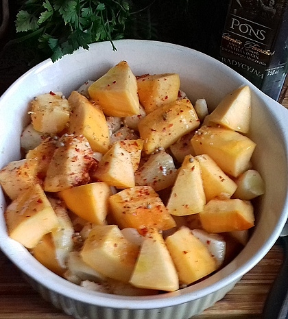 Wstawić do piekarnika, przykryć folią aluminiową lub pokrywą. Zapiekać ok. pół godziny; czas zależy od wielkości kostek i tego, czy maja być al dente, twardawe, czy całkiem miękkie.