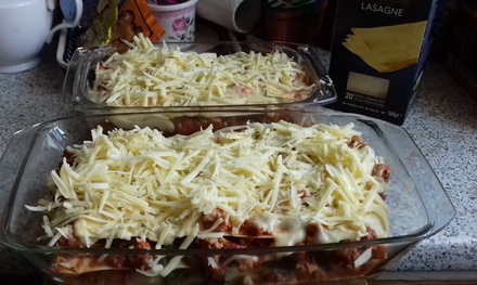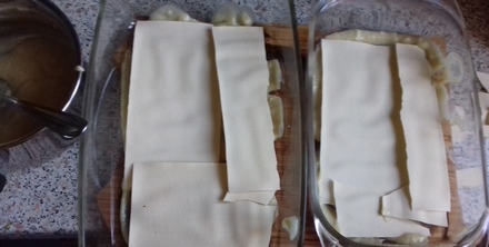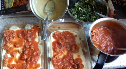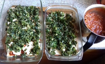 Kolejno układać kolejne płaty ciasta i sosy w tej samej kolejności lub jak chcemy (np. sos boloński tylko po pierwszej warstwie ciasta i przed ostatnią, w środku zaś tylko jarmuż). Ostatni płat starannie pokryć sosem białym, aby nie wystawał żaden kawałek ciasta. Przykryć startym serem.