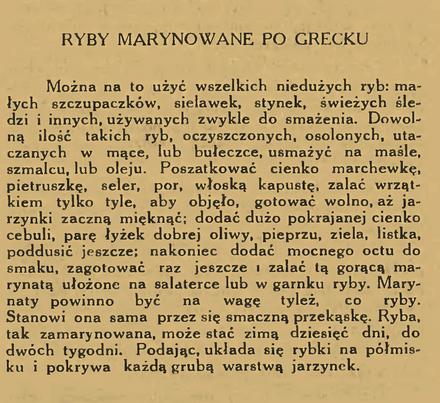 Na początek tradycyjne – a może nie? – przedwojenne ryby po grecku. Różne. I to małe rybki! Przepis zamieścił „Bluszcz” w roku 1927.