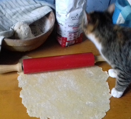 Siekałam swój makaron bezstresowo, choć przy pewnej asyście (widać na zdjęciu). A dopowiem jeszcze, że bardzo lubię to robić. Może nie jest tak cienki, jak ten mojej babci, ale zawsze smaczny. Lepszy do sklepowego.