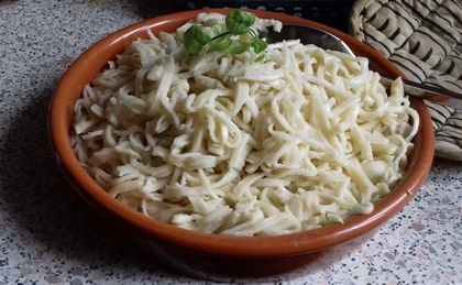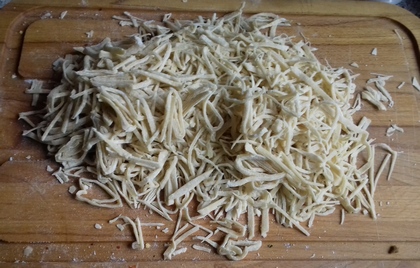 Do takich potraw należy zwykły makaron. Ten przyrządzany własnoręcznie. To wcale nie jest trudne! Nie zabiera wcale wiele czasu. Przy lekkiej wprawie, już od drugiego-trzeciego razu, ciasto zagniata się błyskawicznie, wałkuje jak najcieniej, lekko przesusza i – już, można kroić.