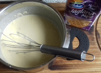 Większe pół kwarty mąki rozbić z jednem jajkiem i mlekiem, żeby się ciasto lało, smarować patelnię masłem lub młodą słoninką i na dobrym ogniu smarzyć [tak!] naleśniki zwykłym