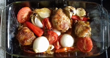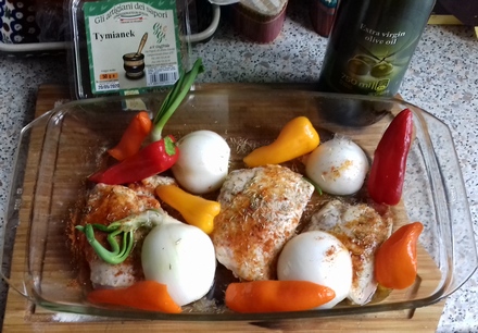 Podudzia kurczaka obmyć, osuszyć, natrzeć papryką i tymiankiem, posolić, skropić oliwą. Cebule przekroić na pół lub na ćwiartki, też posypać przyprawami. Małe papryki przekroić na pół, pozbawić pestek. Wstawić do piekarnika nagrzanego do 180 st. na 20 minut. Podlać odrobiną wody (1–2 łyżki). Odwrócić, piec dalej przez 10–15 minut. Do miękkich udek dołożyć pomidory przekrojone na ćwiartki, posolone, posypane tymiankiem i skropione oliwą. Dopiec przez 10 minut; gdy się lubi chrupką skórkę – 5 minut pod opiekaczem. Podawać kurczaka podlanego z warzywami i sosem, wytworzonym podczas pieczenia.