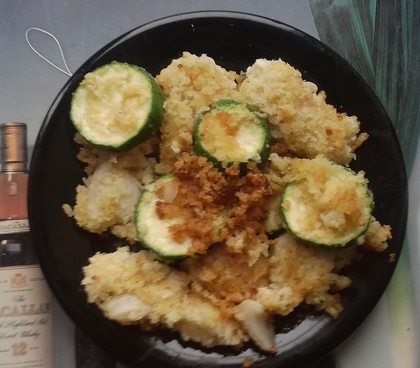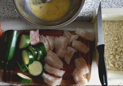 Drugie domowe danie, wymyślone ad hoc, to była ryba. Dorsz, a właściwie tzw. polędwica z dorsza (może być także z mintaja), czyli zwarty kawałek mięsa bez ości. Miałam kupioną rybę, a w lodówce jedną cukinię. Połączyłam jedno z drugim. Potrawa powinna zasmakować dzieciom, zwłaszcza tym gustującym w paluszkach rybnych. Nasze rybne paluszki są z litej ryby, a nie zmielonej z dziwnymi dodatkami. Może dzieciaki schrupią i cukinię? Warzyw nigdy dość, a nie wszystkie grymaśniki je lubią.