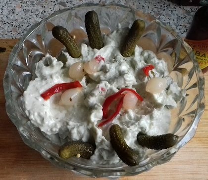 górków, kaparami, sardelami, połówkami rzodkiewek, pomidorami wedle gustu i