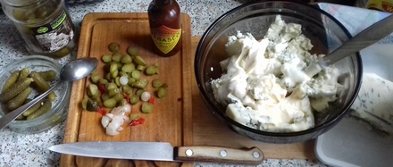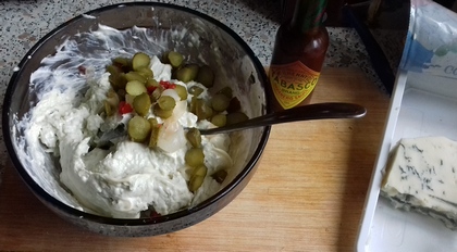 Ser gorgonzola pokruszyć do miski, miksować ze śmietaną lub jogurtem do pożądanej konsystencji. Ogórki, cebulki i paprykę (mogą być z jednego słoika, jeżeli taką marynatę znajdziemy) odcedzić, octu nie wylewać, doprawić nim do smaku pastę serową, jak i zaostrzyć tabasco. Domieszać pokrojone w plasterki ogórki, paprykę i cebulki w całości (część zostawić do dekoracji).