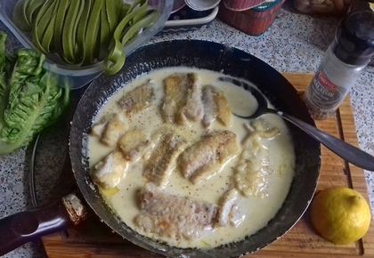 Tę rybę w kremowym sosie o wyrazistym smaku sera podałam do ugotowanego zielonego makaronu tagliatelle. I sałaty rzymskiej z oliwą i sokiem z cytryny.