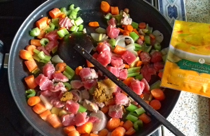 Warzywa oczyścić, pokroić w kostki wielkości tych tuńczyka. Olej rozgrzać na patelni, wrzucić najpierw tuńczyka, a gdy straci surowość – warzywa i korzenie, czyli pokrojone w drobną kosteczkę kurkumę i imbir. Mieszając podsmażać, aż warzywa zaczną mięknąć (ok. 8–10 minut). Wtedy rozprowadzić w nich łyżkę pasty kari.