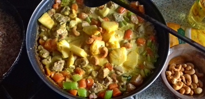 Do tego kari podałam czerwony ryż, ugotowany jak na risotto, czyli po obsmażeniu na patelni z olejem razem z pokrojoną drobno cebulą, podlewany wodą (bulionem) i duszony do miękkości. Co widać na jednym ze zdjęć.