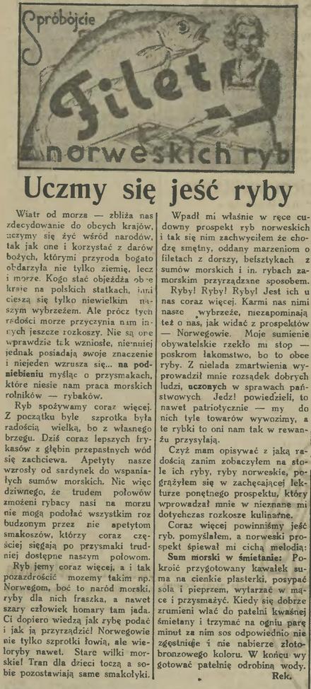 Na początek przedwojenna zachęta do jedzenia ryb. Jest w niej i ciekawy pomysł na przyrządzenie ryby morskiej. To właśnie jedzenia tych ryb Polacy ze środka kraju i z jego Kresów, tak wschodnich, jak zachodnich, dopiero się wtedy uczyli. Ryby wód słodkich jadali, były podstawą postów, ale do tych z morza – poza śledziem – trzeba ich było przekonywać. Jak jest dzisiaj? W ogóle wszystkich ryb jemy za mało. Ale te z mórz nie odstręczają nas już smakiem i zapachem. I dobrze.