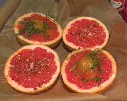 Nie będę oryginalna, gdy wyznam, że cytrusy najbardziej lubię jeść zimą. Może przyciągają zawarte w nich witaminy, tak potrzebne do zwalczania ataków wirusów? Ich kolory ożywiają stół, smak odświeża podniebienie, dzięki nim najnudniejsza potrawa może wskoczyć w nowy wymiar. Skomponowałam cały cytrusowy obiad. Będzie się składał z przystawki, dania głównego i deseru. Każdą z potraw można, oczywiście, przygotować oddzielnie. Ale podane w proponowanym porządku ucieszą każda rodzinę czy grono przyjaciół. Przystawką będą grejpfruty podane na ciepło. Tak, tak! Po zgrillowaniu nabiorą niesamowitego smaku. Pomysł zaczerpnęłam z francuskiego czasopisma, ale ubrałam we własną treść.