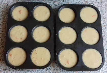 Ciastem wypełnić foremki (tradycyjne trzeba wysmarować masłem i wysypać mąką lub bułką tartą). Piec w 180 st. C ok. 30 minut (po 20 min. sprawdzić patyczkiem, jeżeli jest suchy –zakończyć pieczenie).