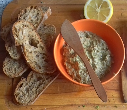 Mięso obrane z wędzonej flondry [!], piklinga, kilka marynowanych w oliwie szprotów, kilka sardynek – co właśnie mamy w spiżarni lub bufecie – utrzeć na masę z taką samą ilością na wagę masła śmietankowego, zmieszać z paru łyżkami ostrego, tartego sera, najlepiej parmezanu i taką ilością dobrej oliwy, aby się masa łatwo smarować dała. Duże, dojrzałe, lecz jędrne pomidory, pokrajać na plastry, co drugi smarować grubo tą masą, składać parami, ułożyć na półmisku, polać obficie oliwą, trochę octem lub cytryną, posolić, popieprzyć, wynieść na chłód. Przed podaniem obłożyć półmisek wkoło jakąkolwiek letnią lub zimową sałatą.