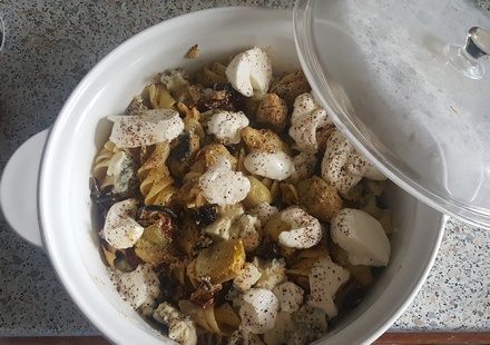 Makaron szybko odcedzić, aby pozostał wilgotny, a trochę wody z gotowania pozostało. Dorzucić go patelni z warzywami, wymieszać. Dodać dwie solidne łyżki jogurtu lub śmietany, wymieszać. Jeżeli za suchy, dodać nieco wody z gotowania.