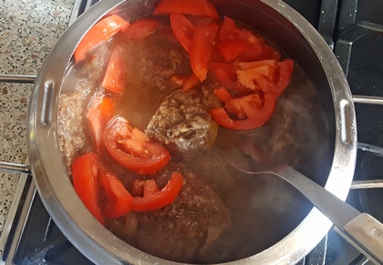 Jako secundo piatto podałam rodzaj ossobucco. Zwracam uwagę, że to po mediolańsku nie zawiera pomidorów, ja je dodałam. Przyrządza się je z giczy cielęcych z kostkami, ja użyłam plastrów pręgi, czuli giczy wołowych, bez kości. Zmieniłam też skład gremolaty, czyli zielonej (a raczej zielono-żółtej) zaprawy, którą wykańcza się danie. Oryginalnie składa się z natki pietruszki i skórki cytrynowej. Ja w miejsce natki posiekałam koperek. Połączony ze skórką startą z cytryny miał smak wiosny. Może nie całkiem włoski, taki bardziej włoski po polsku…
