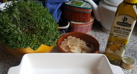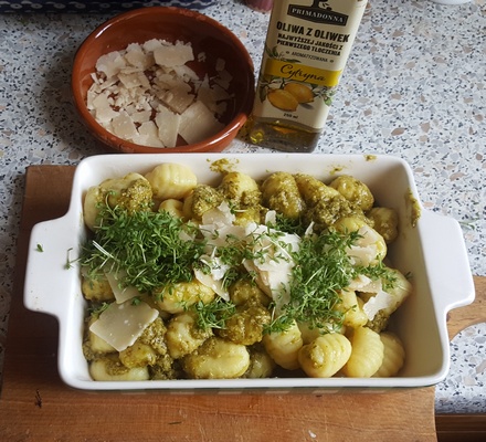W naczyniu do zapiekania lekko posmarowanym oliwą ułożyć ugotowane kluski. Pokryć je sosem, posypać startym grubo parmezanem, skropić oliwą. Zapiekać 20–30 minut w 160 st. C. Podawać posypane świeżo skrojoną rzeżuchą.