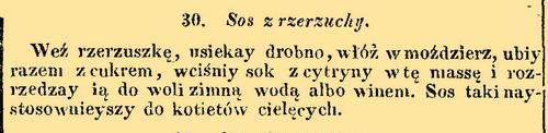 Wziąść [!] 4 żółtek gotowanych na twardo, pół suchej tartej bułki, oliwy łyżkę, garść rzeżuchy drobno siekanej, trochę soli i cukru, utrzeć to wszystko razem i rozprowadzić octem, sos taki można podać do sztuki mięsa białej, oraz wszelkich mięs na zimno.