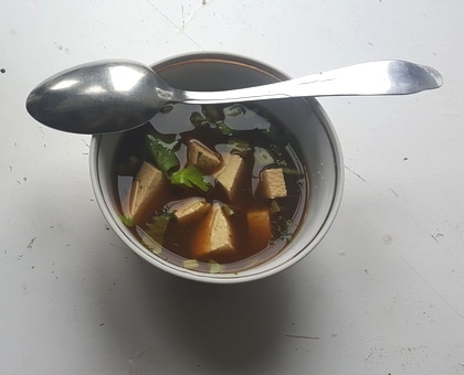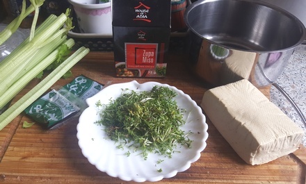 Tofu pokroić w drobną kostkę. Miso rozrzedzić gorącą wodą w proporcji podanej na opakowaniu. Zagotować. Dorzucić listki rzeżuchy i selera naciowego.