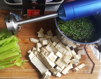 Zmiksować, doprawić do smaku, dorzucić posiekaną drobno gałązkę selera. Gorącym wywarem zalać kostki tofu. Przybrać listkami selera i rzeżuchy. Podawać na gorąco.