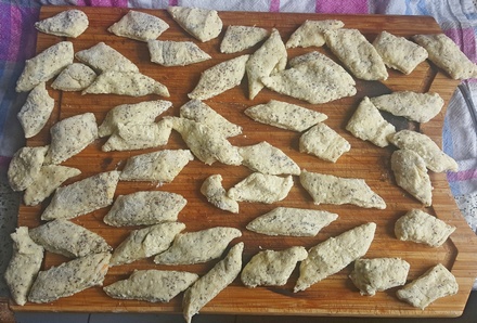 Twaróg pokruszyć, rozetrzeć, zagnieść z dwoma jajkami i taką ilością mąki, aby powstało ciasto zwarte, ale nie z twarde. wygnieść je z makiem, podsypując mąką, aby nie kleiło się do rąk.