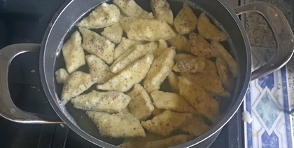 W garnku grzać dobrze osoloną wodę. W tym czasie z ciasta odrywać kawałki (w razie potrzeby omączyć), z każdego utoczyć wałeczek, rozpłaszczyć go, pokroić nożem ukośnie, w romby.