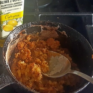 W czasie, gdy pierożki się gotują, zrumienić bułkę tartą (1–2 łyżki), rozprowadzić ją oliwą. Lekko zrumienić.