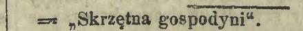 Ciągle wzrastająca u nas drożyzna niemało przyczynia kłopotu tam szczególniej, gdzie stały dochód na utrzymanie domu posiadany czyni koniecznem zachowanie jaknajwiększej oszczędności w wydatkach obok niespuszczania z uwagi togo nieodzownego obowiązku, że pożywienie powinno być posilne i zdrowe! Jeżeli taki stan rzeczy daje się uczuć nawet doświadczonym gospodyniom, to dla młodych, rozpoczynających swój zawód mężatek stanowi on nieraz bardzo ciężkie zadanie. Dotychczasowe przewodniki układu obiadów i przyrządzania potraw, przygotowane dla szerszego kola gospodyń, nie zawsze mogły uczynić zadosyć potrzebie mniej zamożnych gospodarstw, dzisiejszemi okolicznościami wywołanej. Brak ten w naszej kulinarnej literaturze zapełniła książka wydana p. t. „Skrzętna gospodyni”, obejmująca układ i przepisy przyrządzania potraw, ze względu na dwa wyłuszczone wyżej warunki – oszczędności w wydatkach, oraz smacznego i zdrowego pożywienia.