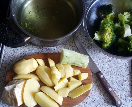 Ziemniaki, łodygi brokuła i seler pokroić w kostkę. Wywar zagrzać, wrzucić warzywa, gotować aż zmiękną (10–15 minut, zależnie od wielkości kostek). Do miękkich warzyw dorzucić różyczki brokuła (dzięki nim zupa będzie miała ładny zielony kolor).