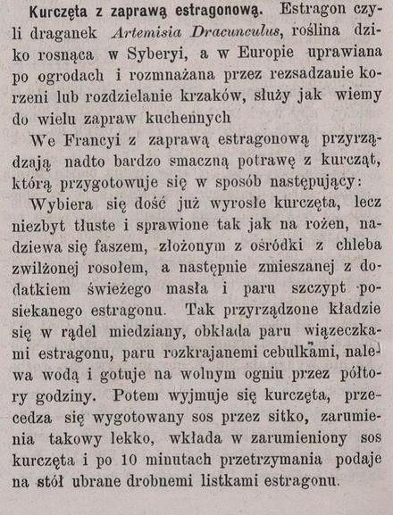 Kurczę z estragonem zupełnie inne znalazłam także w bardzo starym czasopiśmie. To „Gospodyni Wiejska” z rocznika 1878/79. Przepis podpisała Xawera Chojecka. Zdaje się, że była to pani mieszkająca w Kijowie (gdzie aż do roku 1917 była duża i kulturowo prężna kolonia polska), swoje porady i przepisy umieszczała w kilku czasopismach ogrodniczych oraz kobiecych. Do kurczaka wzięła świeży estragon (co jest możliwe latem) i go ugotowała. Podała z sosem. Może ktoś nie ma piekarnika? Ten przepis praprababci mu się przyda.