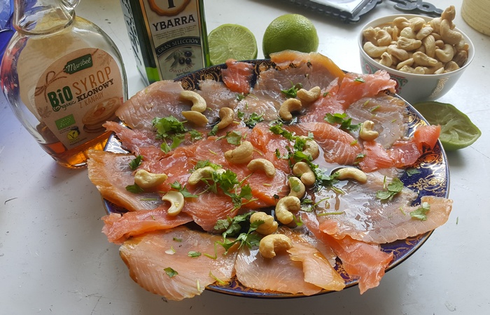Oliwę, sok wyciśnięty z limonki oraz odrobinę syropu klonowego wlać do słoika, zakręcić, potrząsać, aby powstał jednolity sos typu vinaigrette (winegret). Spróbować, doprawić do swojego smaku. Łososia pokroić w jak najcieńsze plasterki, rozłożyć na półmisku, polać winegretem, posypać orzechami (warto je podprażyć na suchej patelni) i przesiekaną kolendrą.
