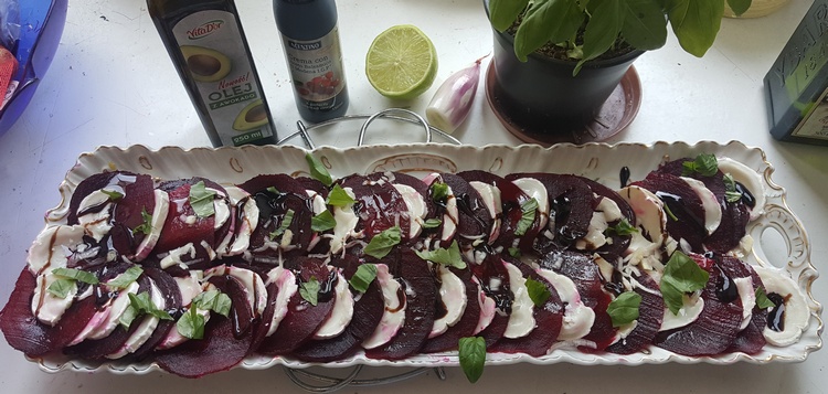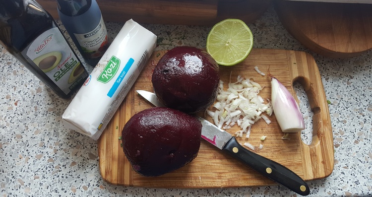 Buraki pokroić w jak najcieńsze plasterki (najlepiej, gdy je upieczemy lub ugotujemy sami, ale te gotowe są błogosławieństwem gotujących). W grubsze plasterki pokroić ser. Na półmisku ułożyć w dachówkę. Posypać szalotką pokojoną w kosteczkę. W słoiku sporządzić winegret wstrząsając olej z awokado, sok z limonki z odrobiną soli (ser jest słony) i pieprzem. Polać danie, skropić octem balsamicznym (krem), posypać porwanymi listkami bazylii.