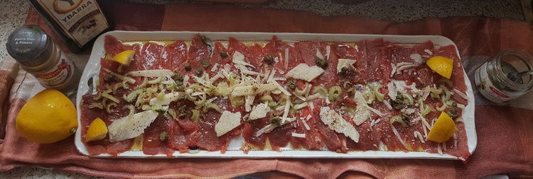 Mięso zawinąć w folie i wstawić do zamrażalnika, aby się zmroziło tak, aby dało się pokroić. Ostrym nożem pokroić w jak najcieńsze plasterki. Seler naciowy obrać z włókien, pokroić w cieniutkie plasterki. Kapary przesiekać. Z cytryny wycisnąć sok i zetrzeć skórkę (po sparzeniu). Plasterki mięsa ułożyć na półmisku, posypać kaparami i skropić oliwą i sokiem z cytryny. Posypać odrobiną startej skórki i kaparami. Ser zetrzeć na grubszej tarce i w cieniutkie płatki. Ułożyć go na mięsie, a na wierzchu posypać pieprzem lub pieprzem z papryką.