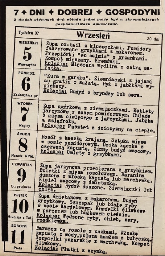 Z ciekawością zerkam na dobór potraw obiadowych i kolacyjnych, jak napisano „w skromniejszych domach” jedno z dań może być opuszczone. Ja opuściłabym kilka, na obiad wystarczyłoby mi… jedno. O kolacji zaś zapominam.
