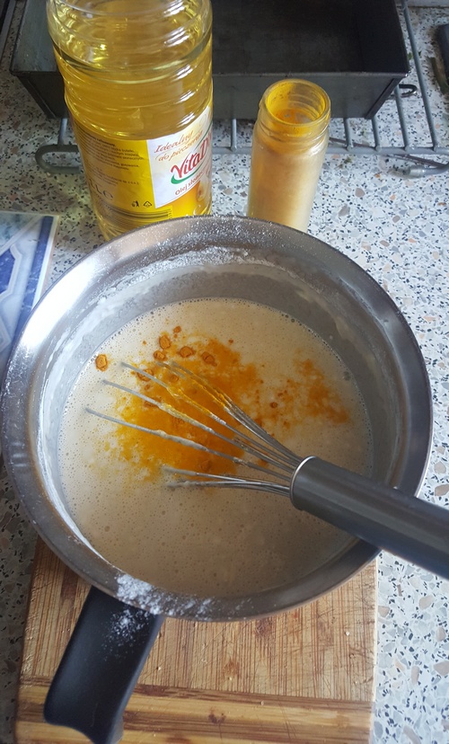 Do ciasta wmieszać pół łyżki kurkumy (dla wyraźniejszego koloru można dać cała łyżkę). Smażyć naleśniki jak zwykle.