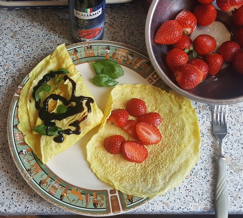 Kto lubi, niech posypie naleśniki cukrem pudrem. Delikatnie. Ale i bez niego są słodkie, bo truskawki już dojrzały. Mogą być oryginalnym deserem. Najlepsze będą na ciepło.