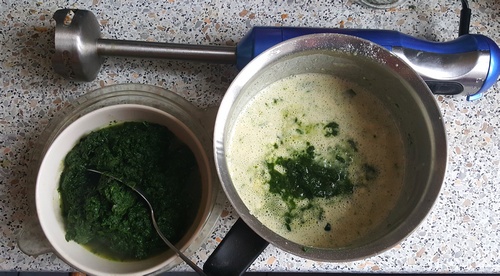 Szpinak rozmrozić na patelni dodając łyżkę masła lub oleju, posolić. Wodę odparować, aby szpinak był gęsty. Dodać go do ciasta naleśnikowego.
