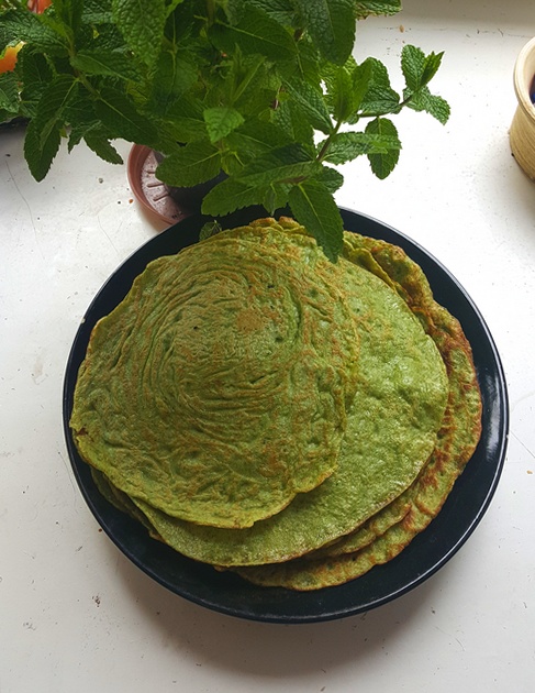 Do żółtych naleśników mogą pasować – zielone. Można je podawać z farszem mięsnym, w rodzaju sosu bolońskiego. Tak zrobiłam, układając je jak tort. Taką konstrukcję nazywamy „lazanją naleśnikową”. Niestety, w ferworze przygotowań nie zrobiłam potrawie zdjęć. Ale kiedyś na blogu już ją opisywałam, można więc znaleźć i jej obrazek. Z wierzchu posypuję ją startym serem i zapiekam.