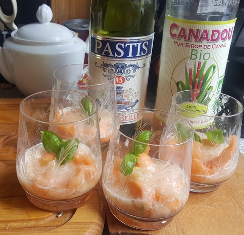 Melon obrać ze skóry, przekroić na pół, wyjąć pestki. Miąższ pokroić w drobną kostkę. Połowę zmiksować na mus z kilkoma łyżkami pastisu i syropem. Do szklaneczek włożyć pozostawione kostki melona, zalać musem, dobrze schłodzić. Podawać z listkami bazylii lub mięty.