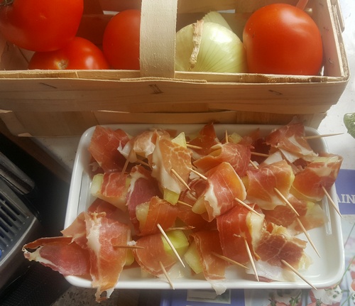 Ten przepis jest tak prosty, że go nawet nie znakuję jako moją własność. Szynkę dojrzewającą można zastąpić każdą inną suszoną wędliną. Od biedy i szynką gotowaną. Przystawkę przed podaniem warto przybrać ziołami.