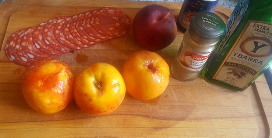Kolejna przystawka nie będzie już z melona, lecz z brzoskwiń. Połączyłam je z hiszpańskim, paprykowanym chorizo. Efekt odlotowy. Pobudza smak. Pasuje do hiszpańskiego wina.