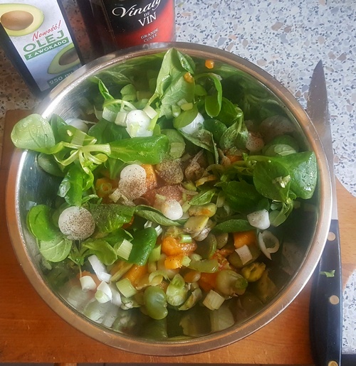 Pozostałości z brzoskwini kroimy w kostkę i dodajemy je do sałaty. Ja miałam roszponkę. A także ugotowany bób. Z resztek więc powstała oryginalna kompozycja sałatkowa, pyszna do pszennego pieczywa.