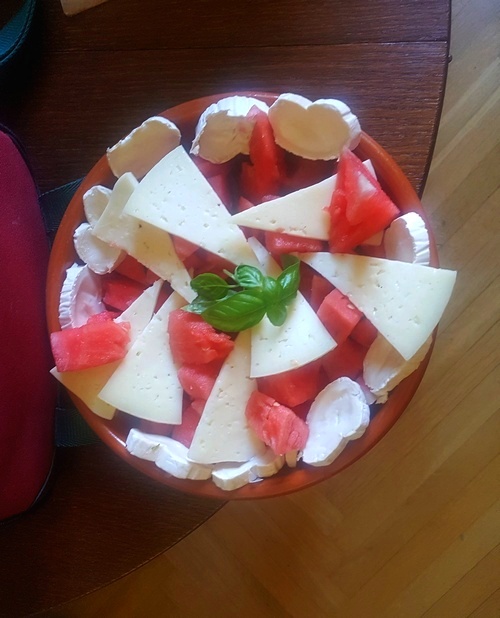 Arbuza obrać ze skórki, oczyścić z pestek. Miąższ pokroić w większe kostki. Schłodzić je. Przed podaniem skropić lekko oliwą, pokryć plasterkami koziego sera pleśniowego i trójkątami lub plasterkami sera twardego. Posypać pieprzem, przybrać listkami bazylii lub kolendry.