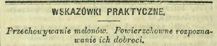 W kąciku miłośników dawnej prasy podam praktyczną poradę dotyczącą melona. Nie wiadomo którego gatunku, przyjmijmy że każdego. W roku 1885 zamieścił ją „Kurier Warszawski”. Z gazetą musiała współpracować osoba znająca się na kulinariach i gospodarowaniu. Może była to sama pani Lucyna Ćwierczakiewiczowa, wówczas znajdująca się u szczytu popularności i często w gazecie wspominana (nawet w felietonach samego Bolesława Prusa!). Porady podpisane niestety nie są. Przytaczam je w pisowni oryginału.